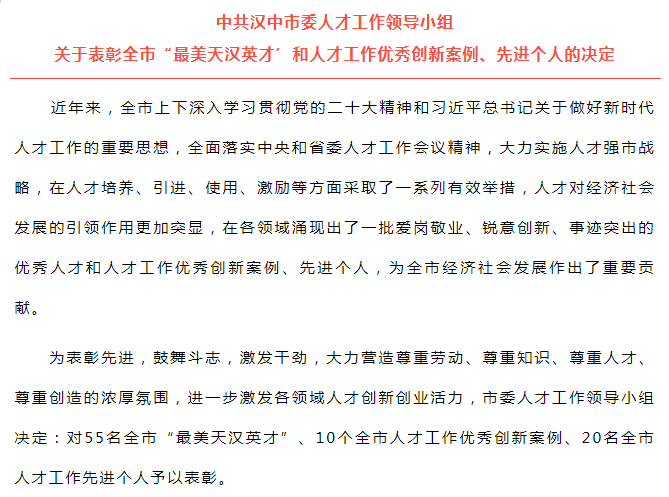 此次評選根據(jù)《中共漢中市委組織部關(guān)于開展全市“最美天漢英才”和人才工作優(yōu)秀創(chuàng)新案例、先進(jìn)個(gè)人評選工作的通知》精神,經(jīng)逐級遴選和嚴(yán)格審核把關(guān)。